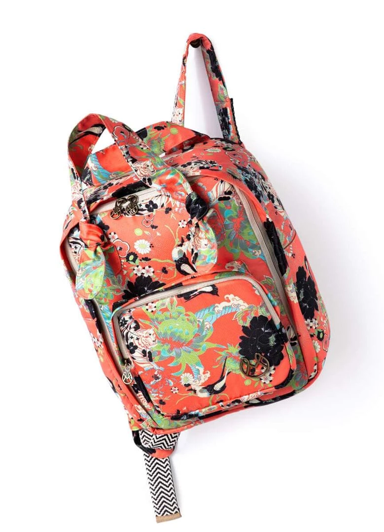 It’s made of a durable, heavy-duty fabric and has a rigid bottom for stabilization. Short handles at the top make it easy to carry the backpack as a tote, and adjustable straps allow it to fit just right on your back. It is lined with a surprise Maaji print.
