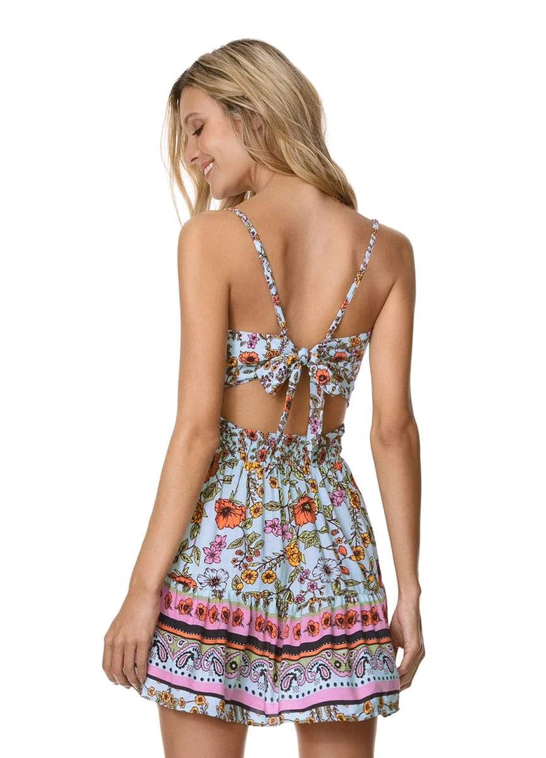 Florentina is a mix between a skirt and a crop top that ends up in a unique dress. With adjustable straps, flounce hem, and V neckline, this short dress is up for a fun day at the beach. Wear it knotted at the back or in the front for two different but glamourous looks.