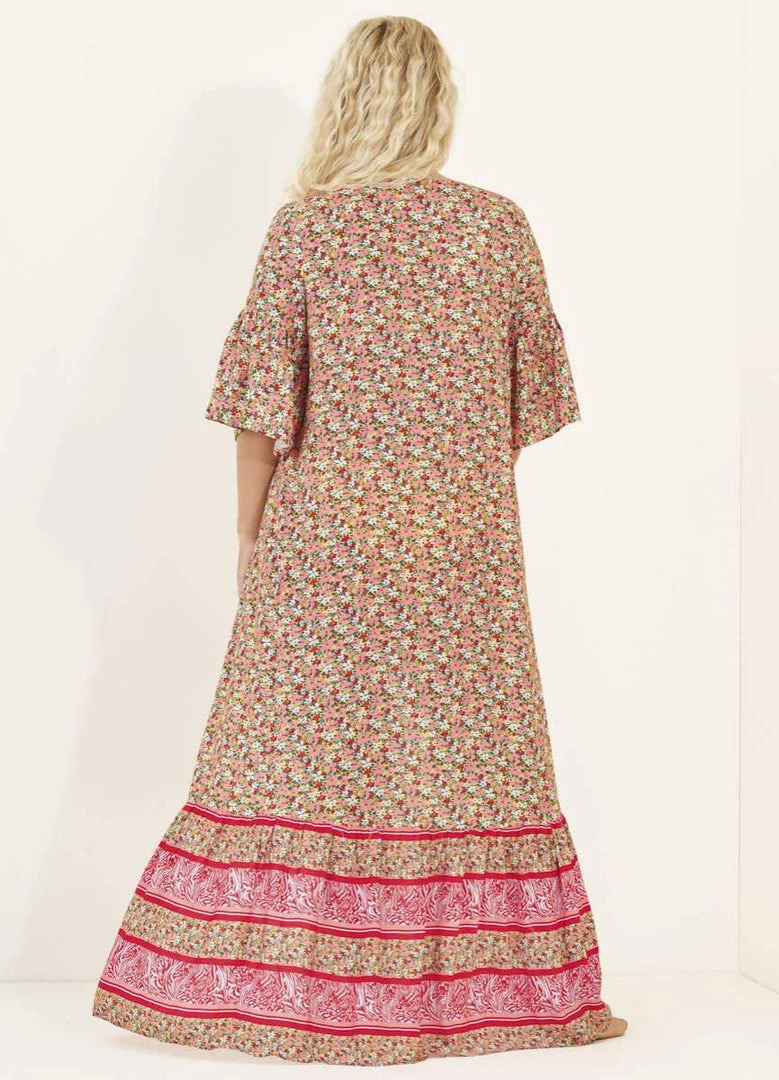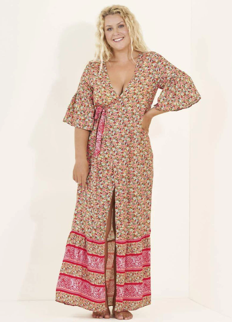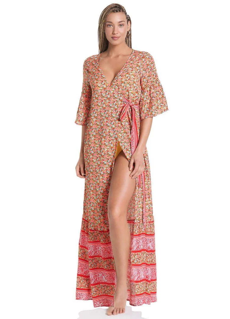 Josephine is a long and flowy beach cover-up that features a magical print and flounce hem. It has front waist-tie closure for a pulled-together look no matter where you are. This kimono has short sleeves that embellish the look, wear it close or as a layer!