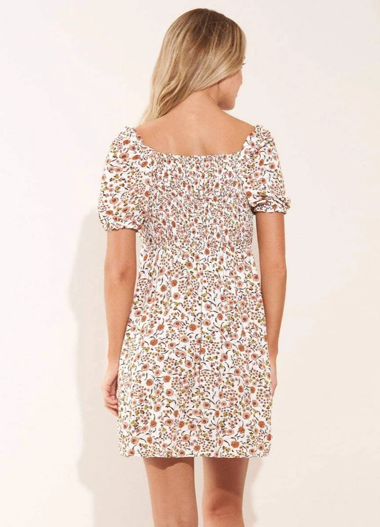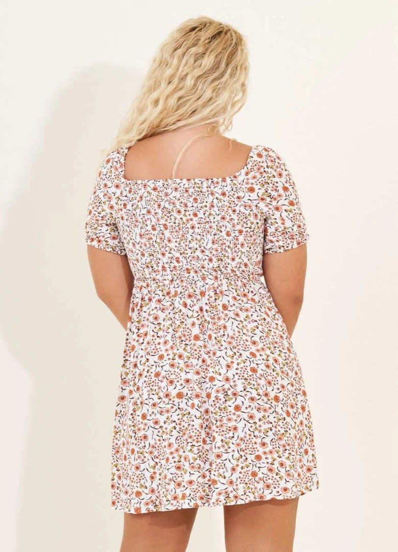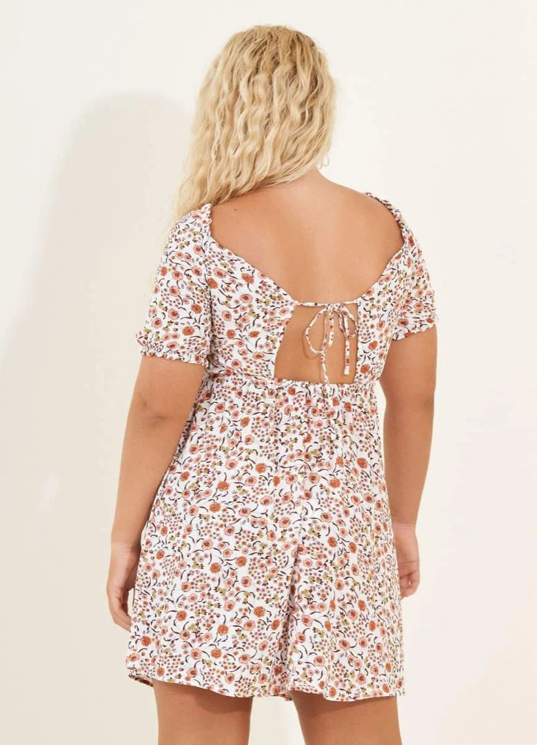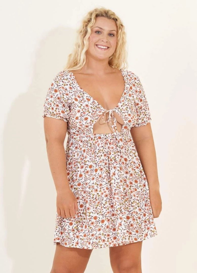 Lucy is a sweet piece for the girl that loves a more conservative garment. This short dress is up for any task with a ruched front, natural waist, and short sleeves. Wear it knotted at the back or in the front for two different but unique looks.