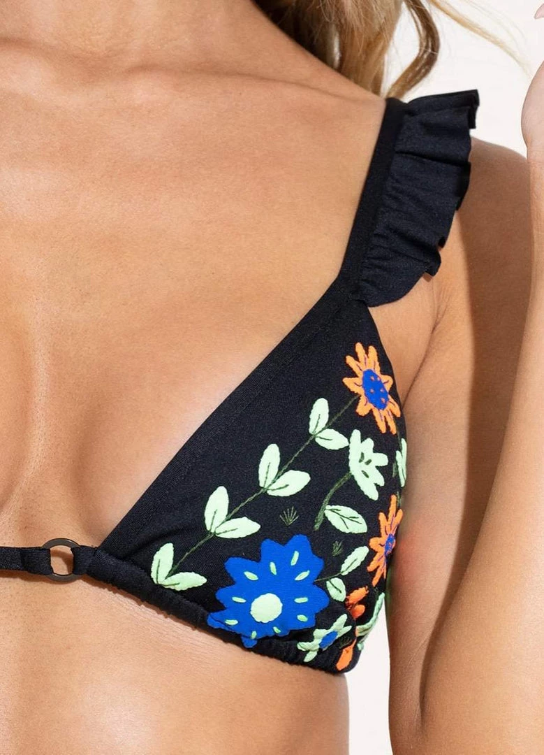 Mixing triangles and ruffles are a hit. Is having the best of both worlds: the feminine and pretty and the daring and adventurous girl. Low coverage, adjustable straps, and lace-up back are a plus for this fantastic bikini top.