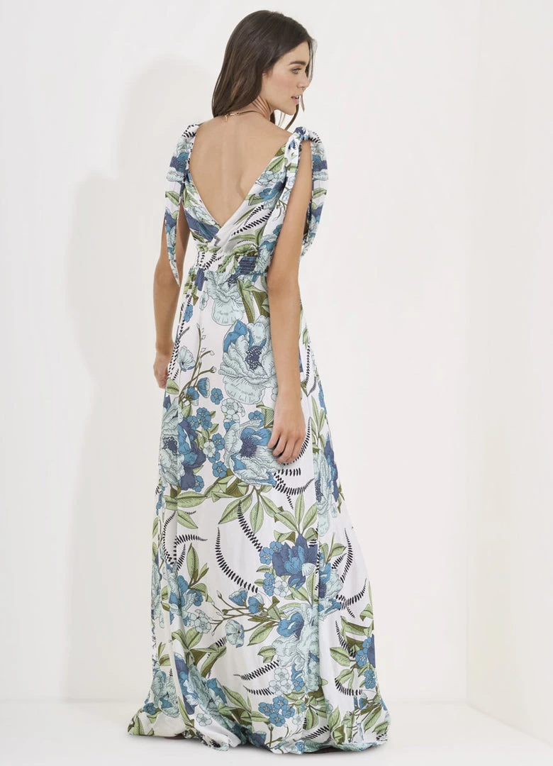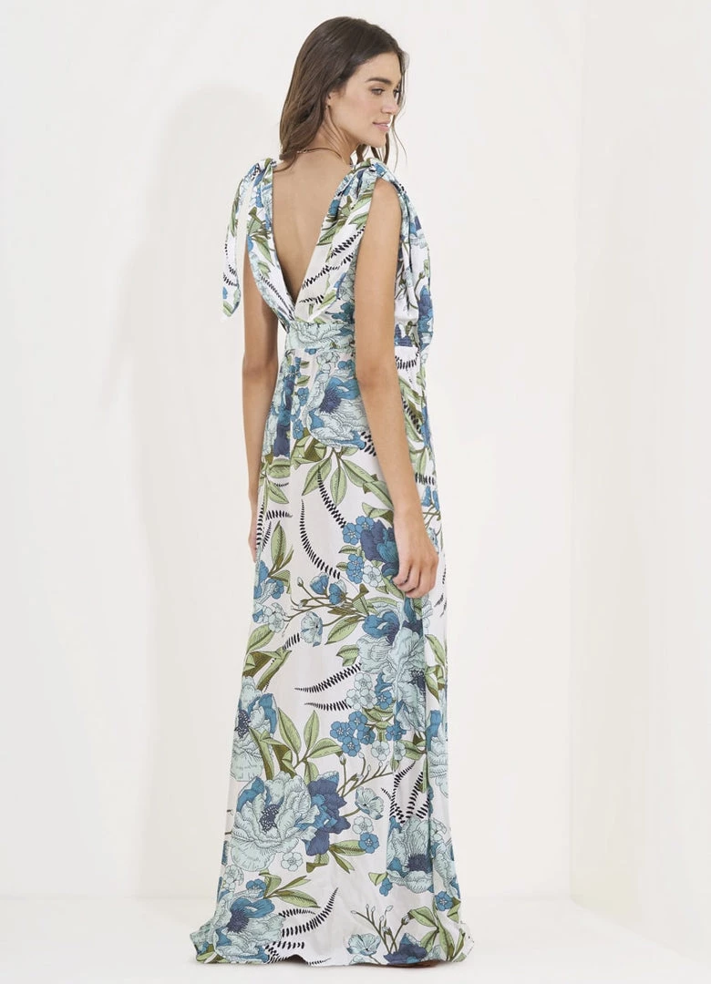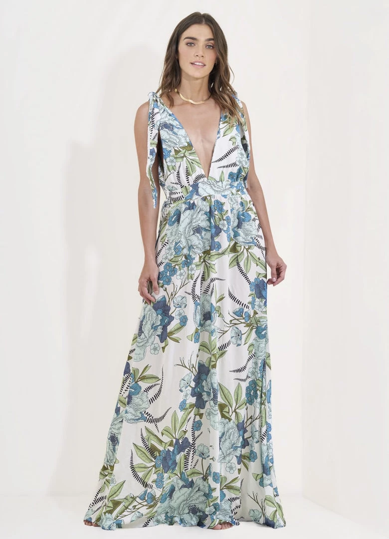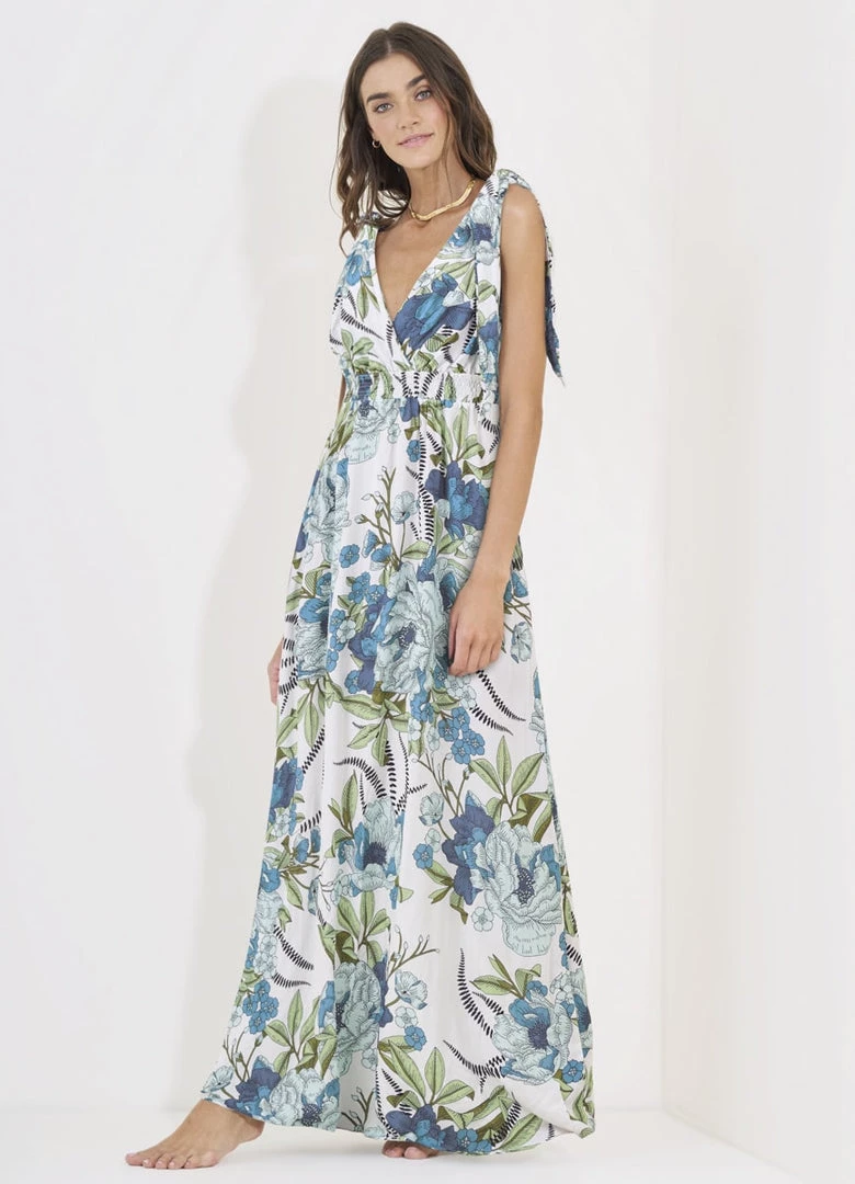 We wish you friends, sun, holidays & Dalia forever! Our long dress with beautiful print, sexy cleavage, and an adjustable waistband is here this season to shape up your body under the sun
