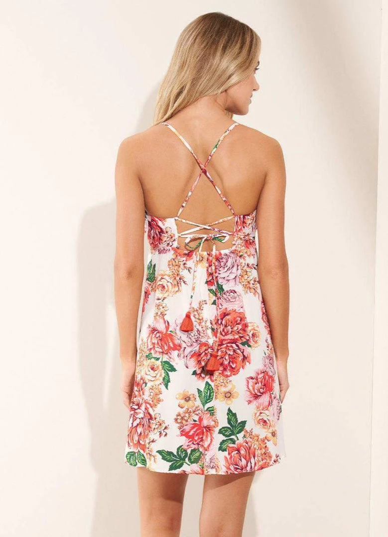 Paulina is a short dress designed to provide comfort. The adjustable straps, ruched front, and lace-up tie at the back allow you to control de coverage you want. Wear it for a walk down the shore o for brunch with your friends!