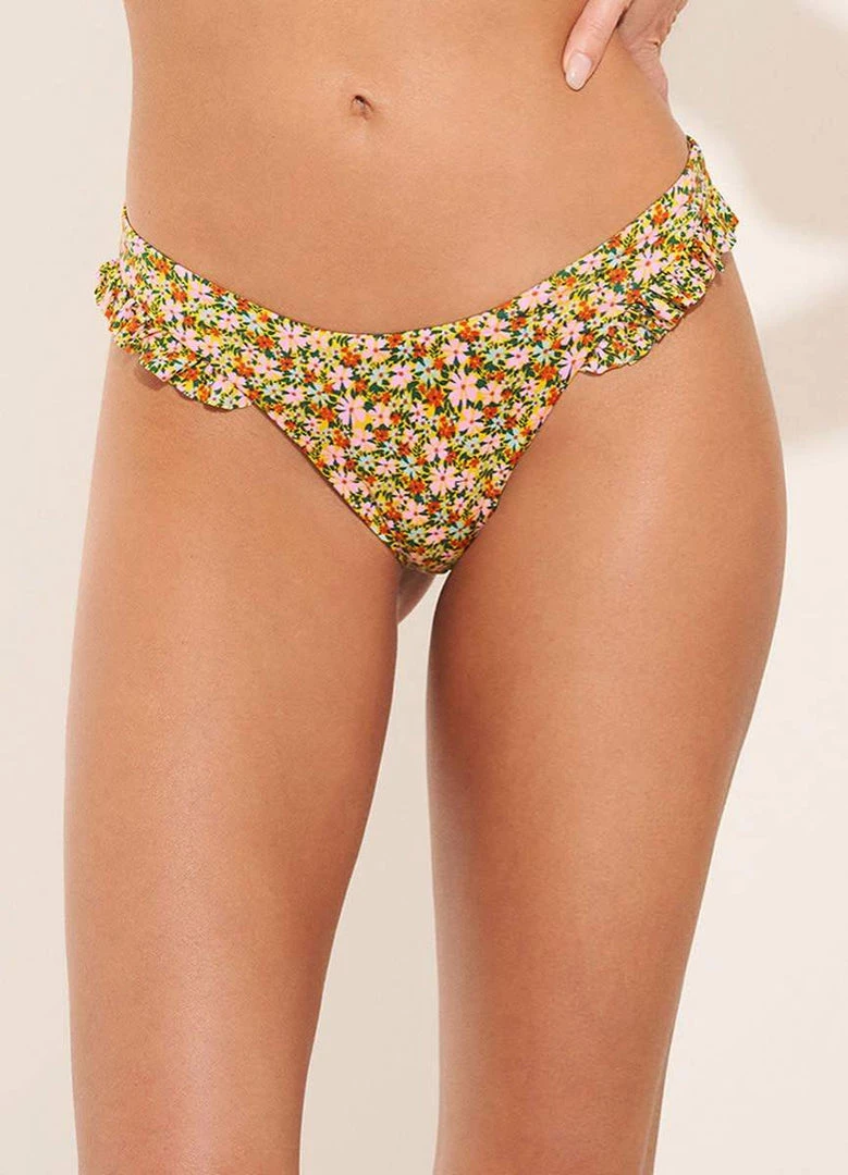 A feminine piece that gathers ruffle details and low coverage silhouettes is Voyage. A cute but sexy garment you can suit with your favorite ruffles bikini top.