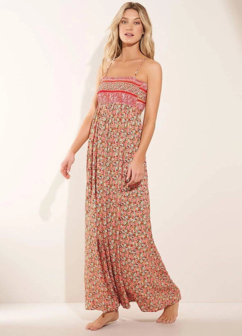 Smocked silhouettes you will love and this long dress. The Emery is a maxi dress that will provide comfort and a stylish look! This piece features a Maajical print, A-line shaping, and soft, lightweight fabric. Wear it in two different ways! It is perfect for any occasion at the beach or a night walk by the shore!