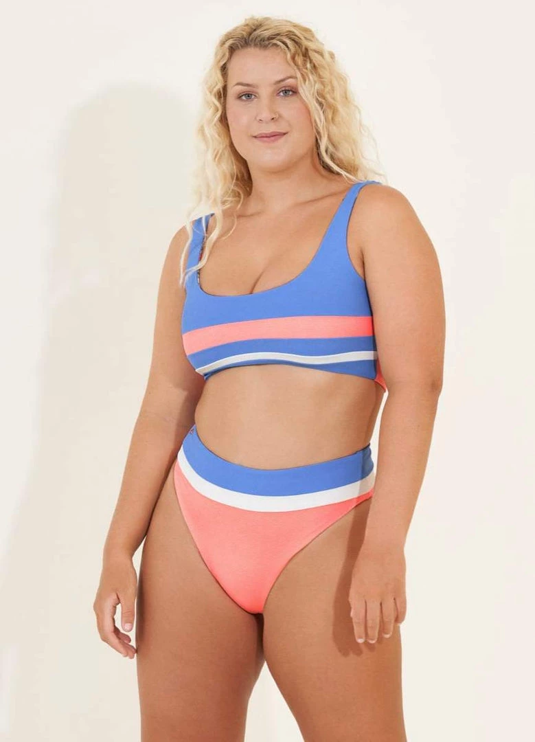 Print mix and sporty silhouettes are a fashion statement. That’s why we created Izzy. With moderate coverage and wide straps, this top gives you four ways to wear it, giving you different looks each time! Pair this bikini top with the Vicky bottom for a match made in heaven.