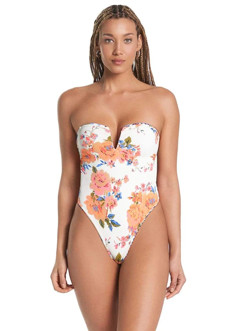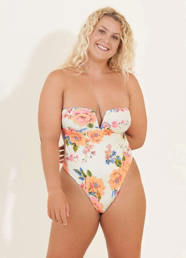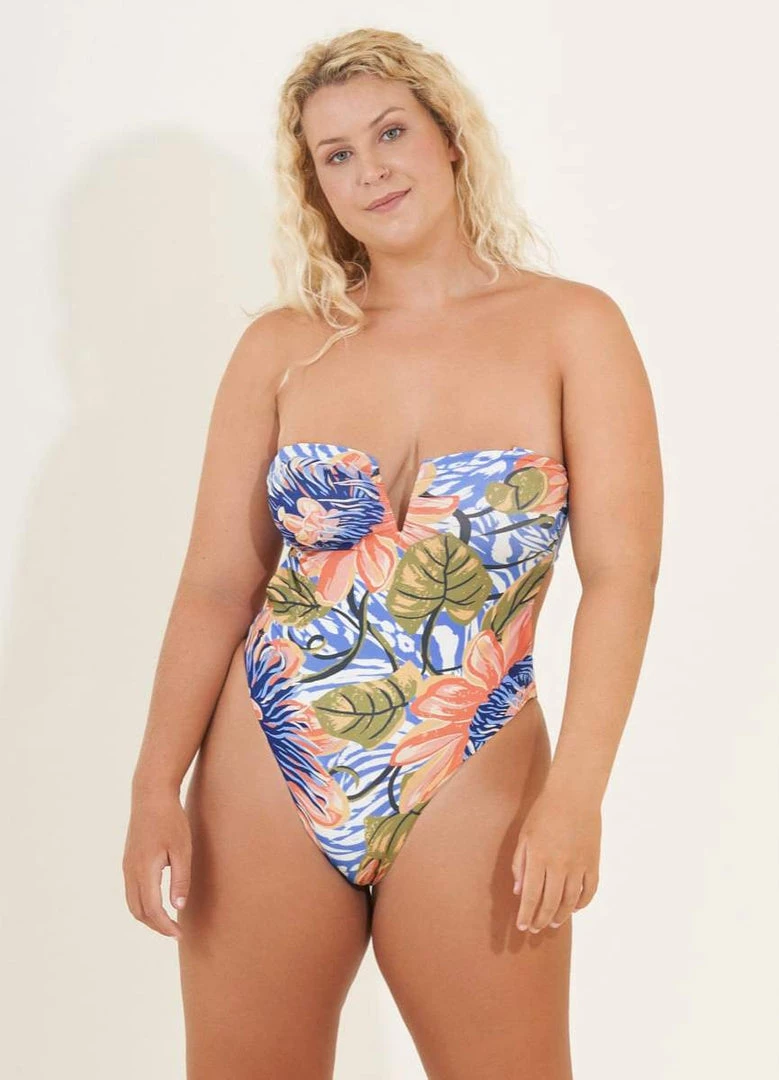 Solei, a must for any season. A one-piece that will enhance your curves while having lots of fun at the beach or pool! The strapless v-wire shape and lace-up back put the cherry on top, making this a show-stopper piece.