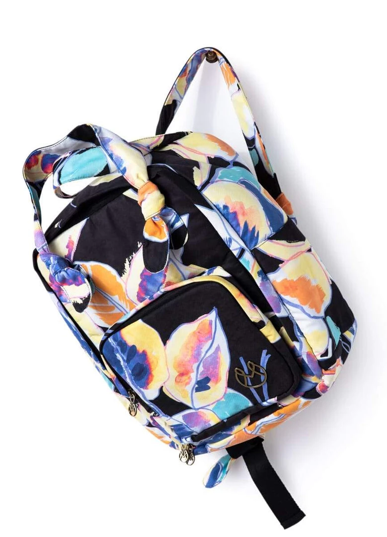 It’s made of a durable, heavy-duty fabric and has a rigid bottom for stabilization. Short handles at the top make it easy to carry the backpack as a tote, and adjustable straps allow it to fit just right on your back. It is lined with a surprise Maaji print.