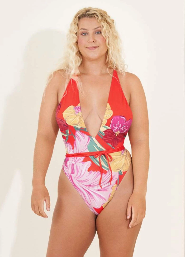 Elegant and classy in the front, wild and sassy in the back. Our newest unique and ultra-flattering one-piece swimsuit, The Orchid, features outstanding unique attributes that will make you love it! Plunge neck, tie back, cheeky coverage, and wide straps are some of them! You can miss it!