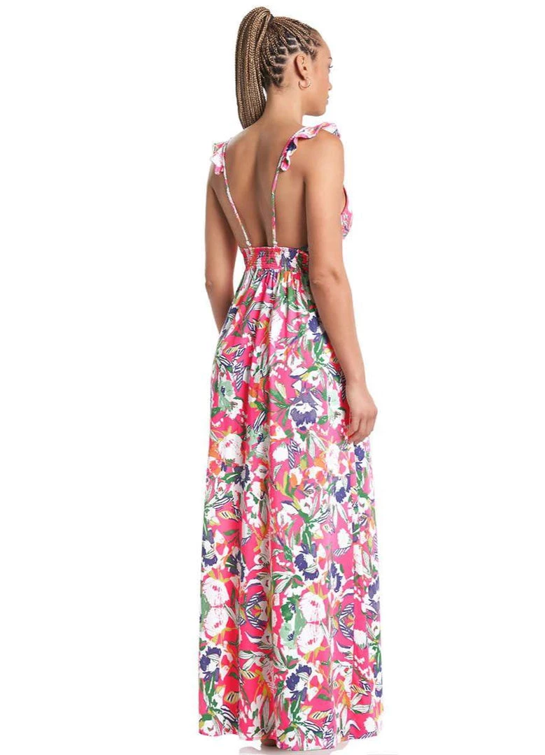 Loving is a long beach dress that features a plunging neckline, an open back, and a smocked waistband. Made of a soft, lightweight fabric in a fantastic Maaji print, this full of ruffles dress is a stylish addition to your holiday wardrobe.