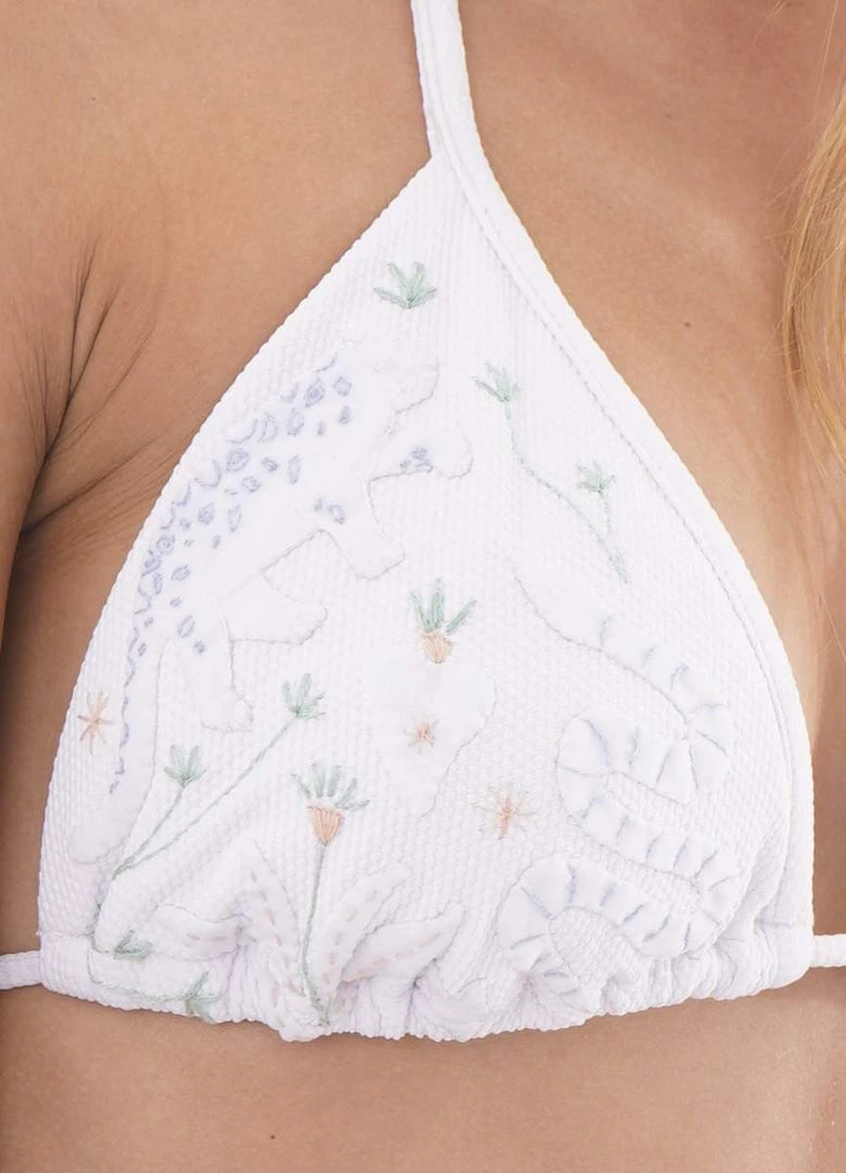 Balmy, where have you been all our lives? The perfect sliding triangle bikini top for summer vacations. With adjustable straps that tie at the neck and back and its low coverage, this bikini top is a must for every girl!