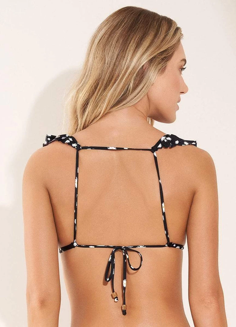 Mixing triangles and ruffles are a hit. Is having the best of both worlds: the feminine and pretty and the daring and adventurous girl. Low coverage, adjustable straps, and lace-up back are a plus for this fantastic bikini top.