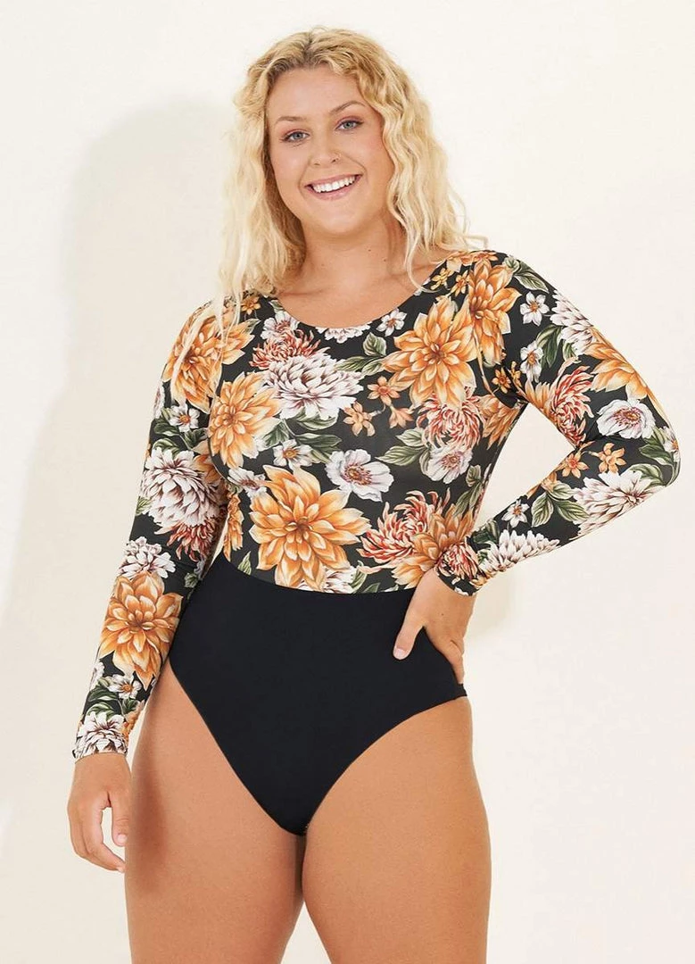 Feeling sassy and classy while being covered was never that easy! Sky features long sleeves, a covered front but a sexy open back. The print mix makes this piece a statement for any girl! This piece is part of our eco-friendly line.