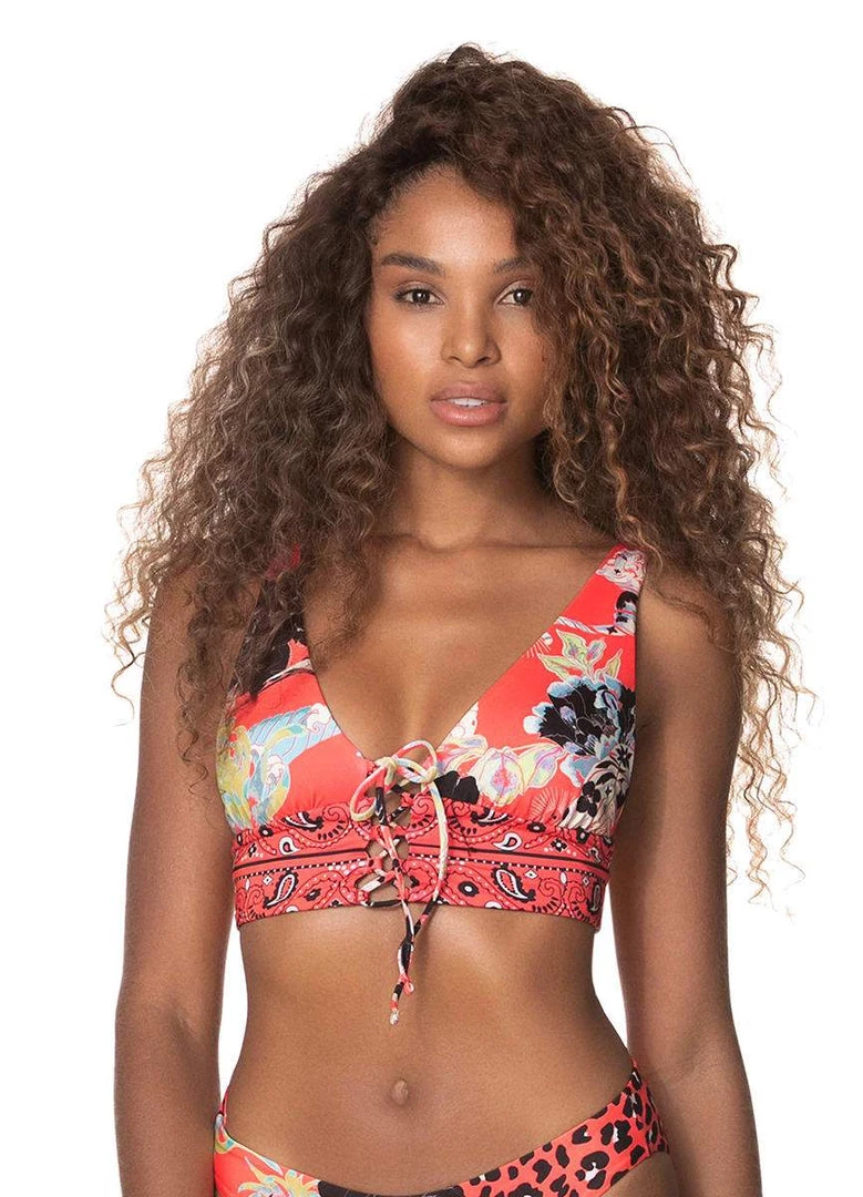 The Creator is an exclusive and eye-catching Bikini Top. An elegant longline calls attention. Grommets and lace-up front make it a comfortable and adjustable silhouette, and the crossed straps in the back accentuate your figure. Details that will catch your heart.